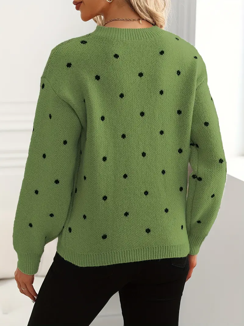El jersey Ciara es la prenda ideal para esta temporada. Con su atemporal estampado de lunares y su suave tejido de punto, combina a la perfección estilo y comodidad. Gracias a su corte relajado y a su diseño versátil, combina fácilmente con vaqueros, faldas o pantalones, por lo que es perfecto para los días frescos y los momentos relajados. Ya sea para pasear por la ciudad o tomar un café con los amigos, con el jersey Ava siempre irás elegante y cómoda.