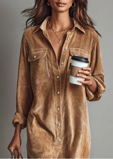 El vestido Niyara combina sofisticación casual con un encanto atemporal y moderno. Su diseño camisero de pana suave ofrece una silueta fluida y elegante, mientras que los botones frontales y los bolsillos con solapa aportan un toque funcional y refinado. Ideal para los días en los que deseas proyectar confianza, calidez y estilo sin esfuerzo.