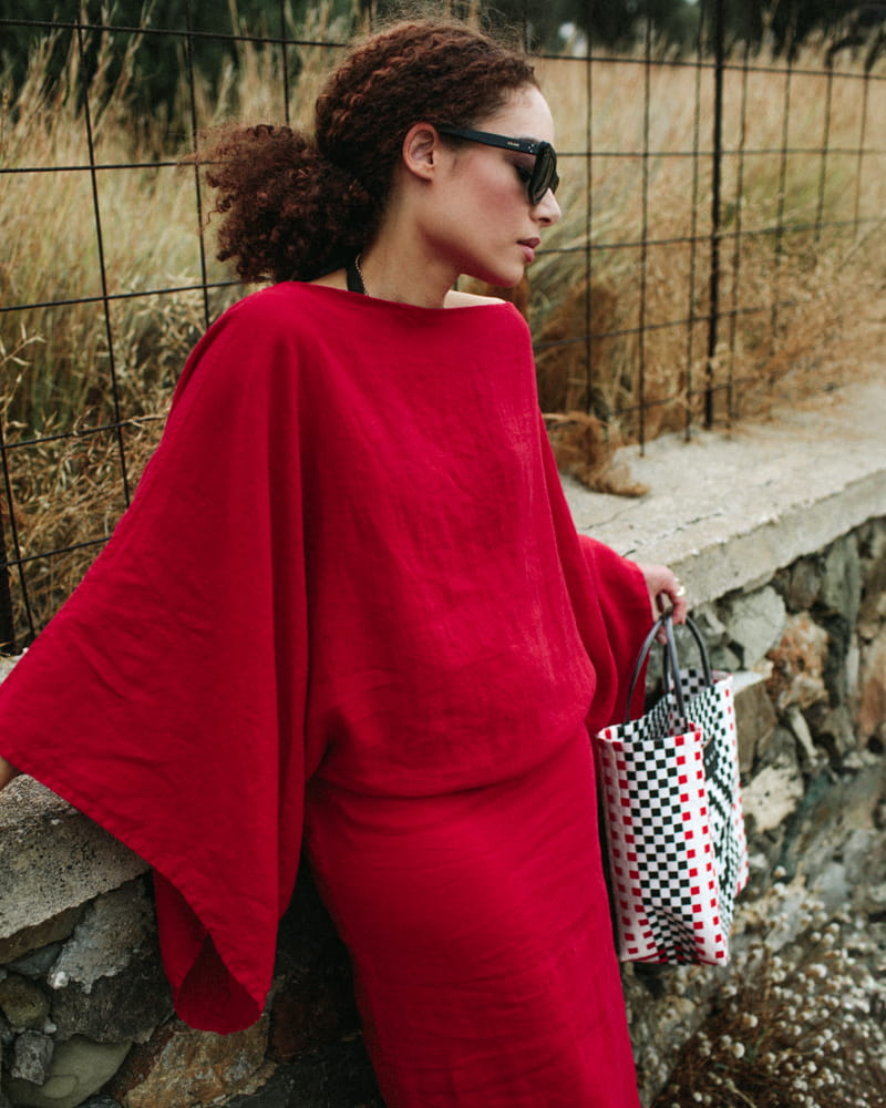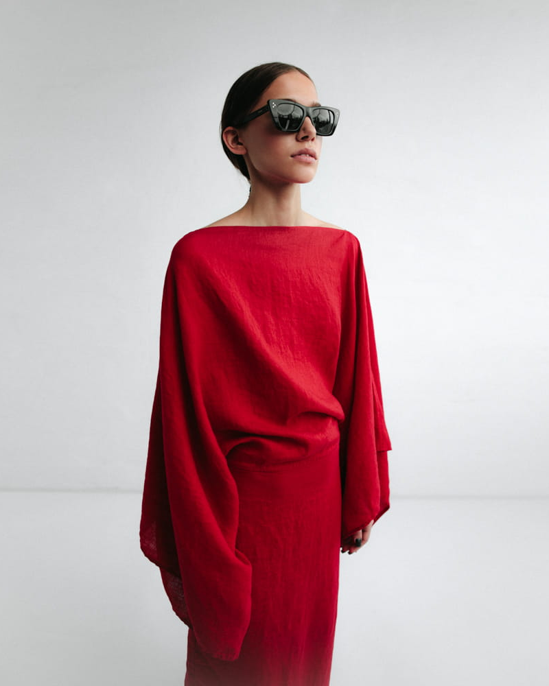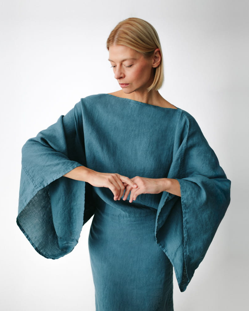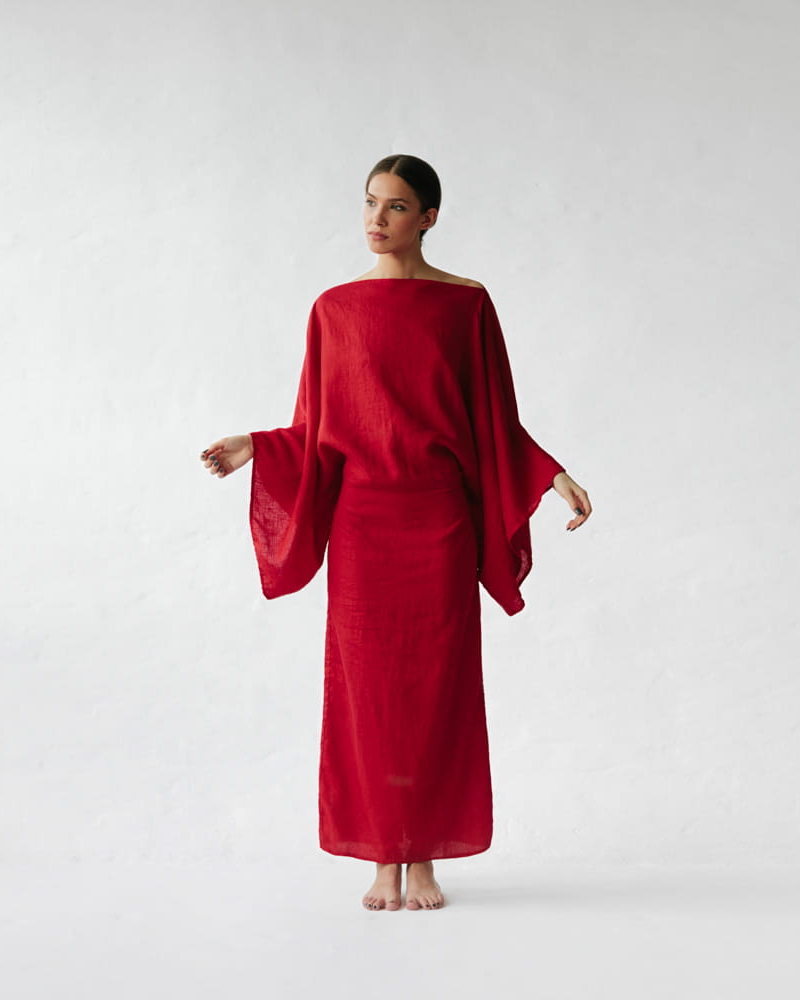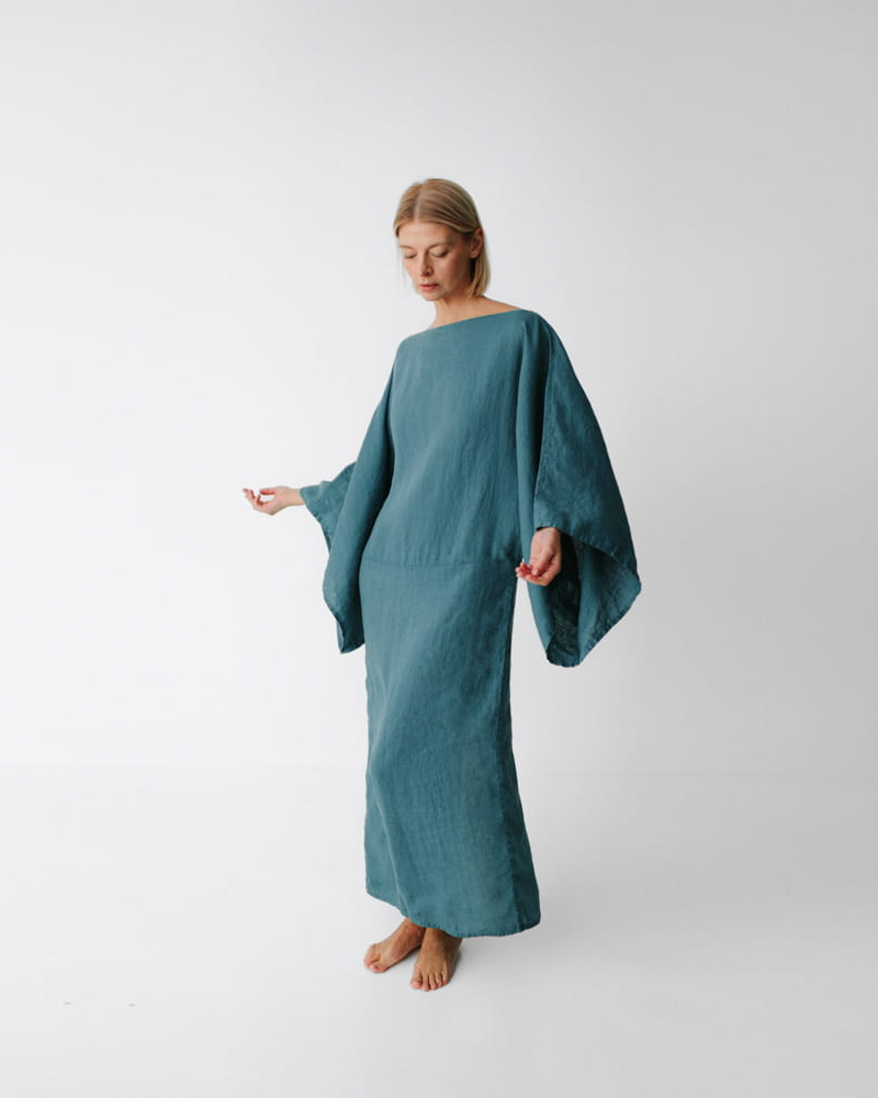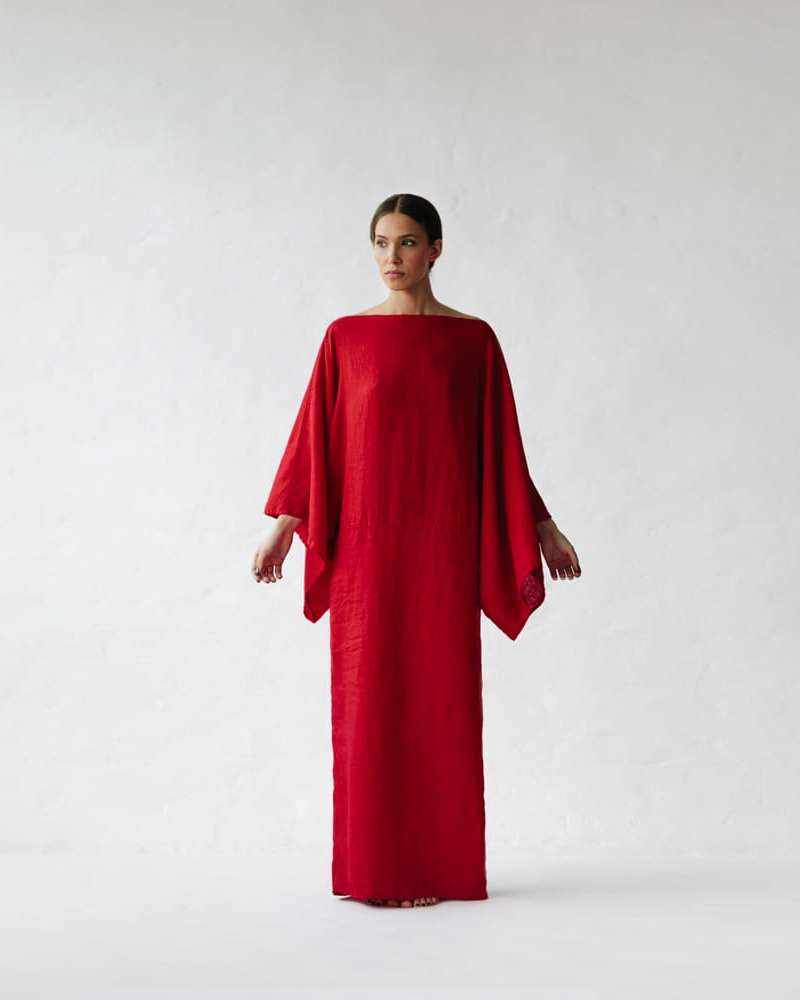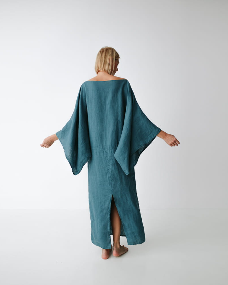 El vestido Noura transmite una presencia serena con su escote barco y mangas murciélago fluidas, confeccionado en lino 100 % transpirable. Su largo midi-maxi, cintura entallada y corte relajado logran un equilibrio ideal entre sofisticación y comodidad ligera.