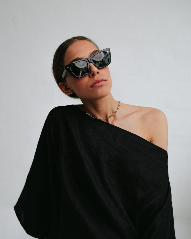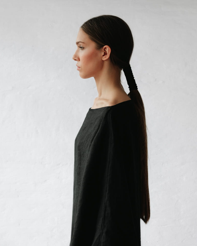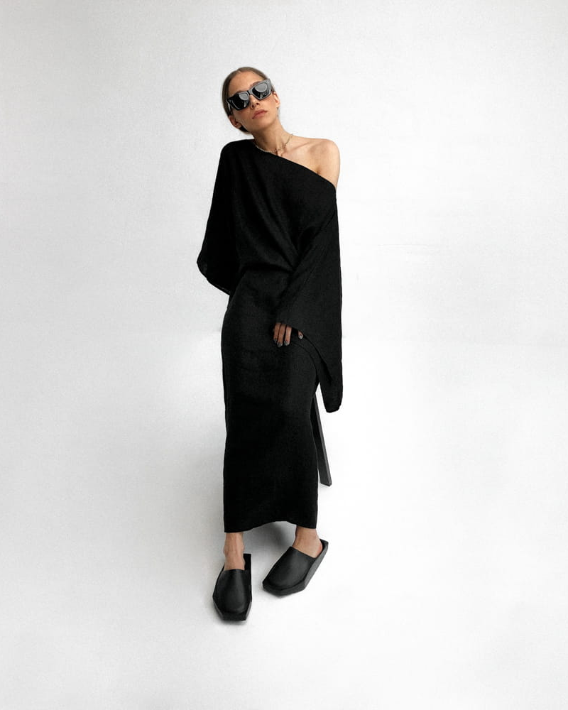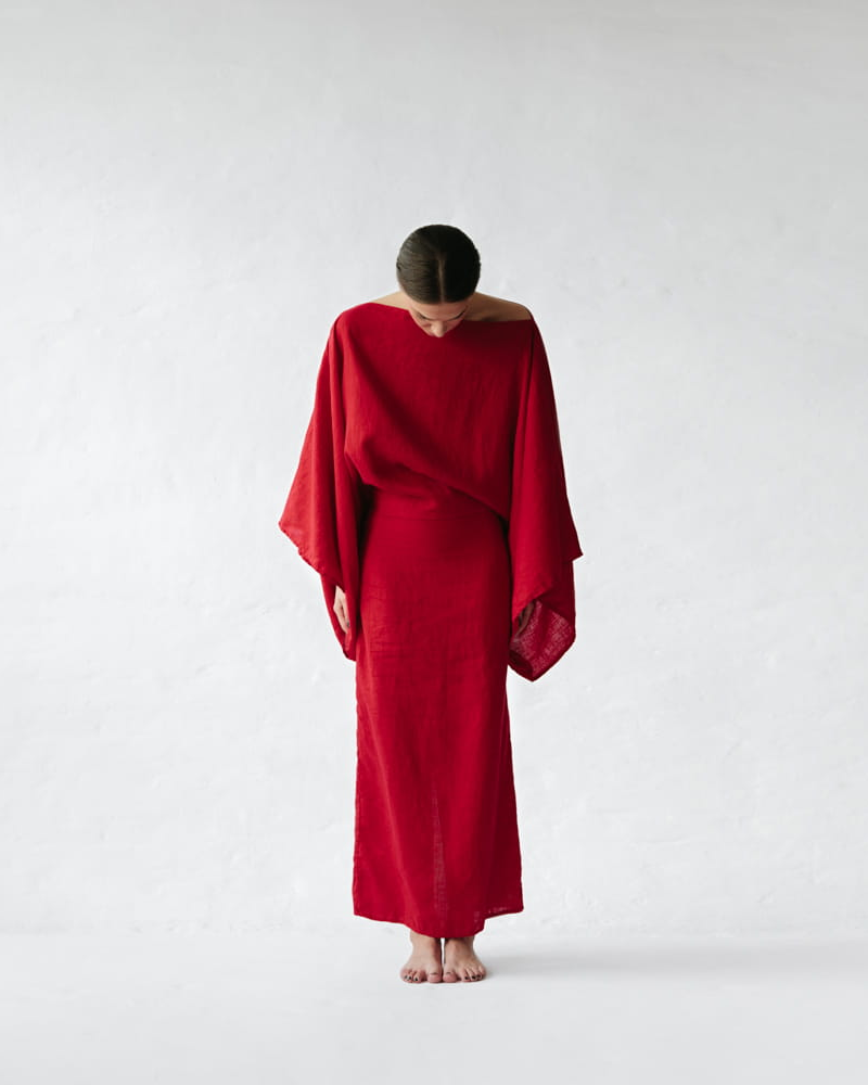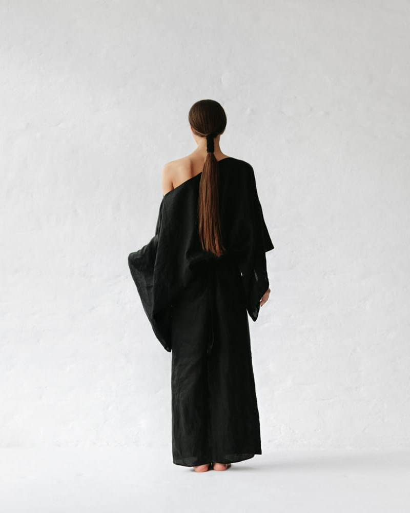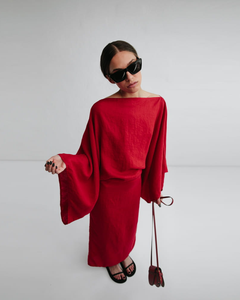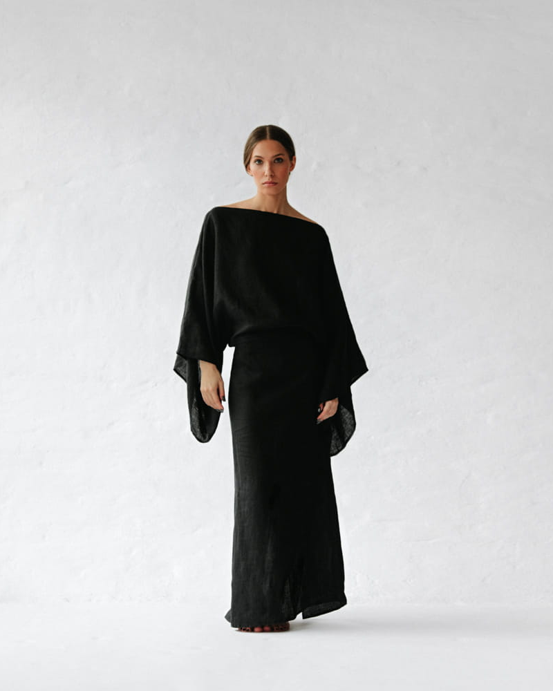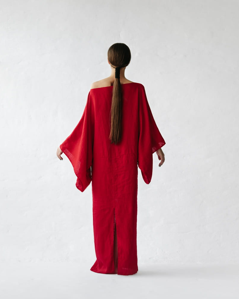 El vestido Noura transmite una presencia serena con su escote barco y mangas murciélago fluidas, confeccionado en lino 100 % transpirable. Su largo midi-maxi, cintura entallada y corte relajado logran un equilibrio ideal entre sofisticación y comodidad ligera.